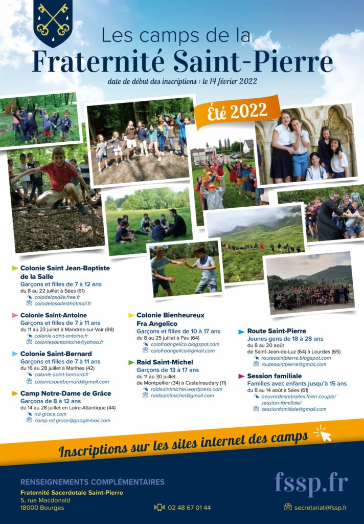Comme chaque été, les prêtres et séminaristes de la Fraternité Saint-Pierre organisent différentes camps et colonies pour jeunes et familles pendant l’été. Les inscriptions sont désormais ouvertes.