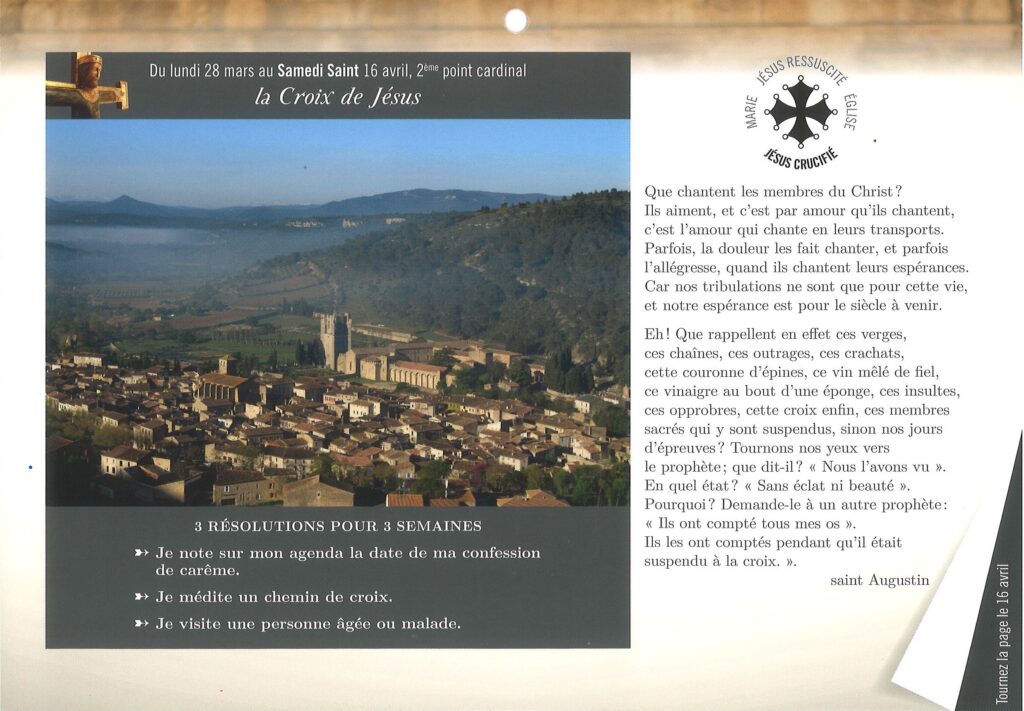 Accueil » Nos archives » Calendrier de Carême (2) Summorum Pontificum Calendrier de Carême (2) Les Chanoines Réguliers de la Mère de Dieu (Abbaye de Lagrasse) ont publié de Carême avec quelques pensées spirituelles et quelques bonnes résolutions jusqu’au dimanche de la Sainte-Trinité. Abbaye de Lagrasse Article précédentVidéo: Le Club des hommes en noir évoque la récente réforme de la Curie Article suivantDimanche de Laetare 26 mars 2022