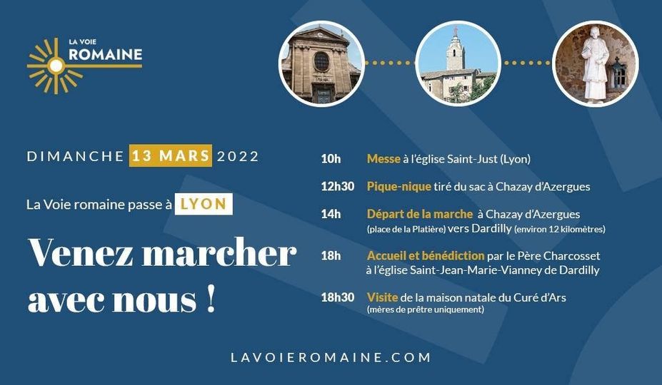 Accueil » Nos archives » La Voie romaine : Les marcheuses passent à Lyon Summorum Pontificum La Voie romaine : Les marcheuses passent à Lyon Les Mères de prêtres de la Voie romaine passent à Lyon ce week-end. Vous pouvez vous joindre à la marche ce dimanche. La Voie romaine (facebook) Article précédentDernière lettre aux Amis et bienfaiteurs de la Fraternité Saint-Pierre (Mars 2022) Article suivantJournée portes-ouvertes à l'Ecole Sainte-Cécile et Collège Sainte-Philomène (Annecy) le 12 mars 10 mars 2022