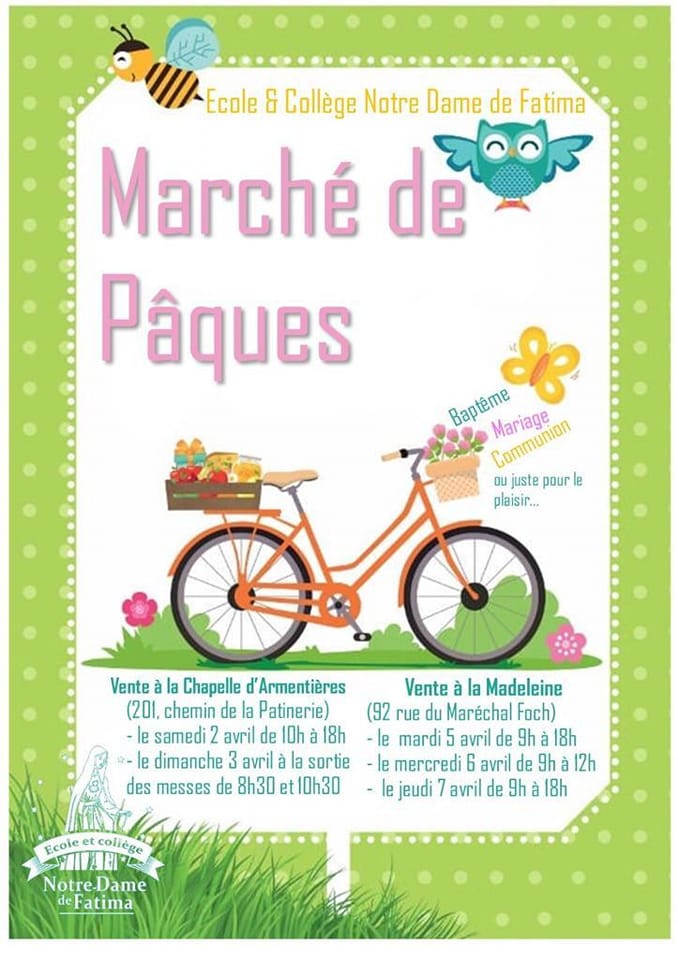 Un lecteur nous demande d’annoncer le Marché de Pâques de l’Ecole Notre-Dame de Fatima (La Chapelle d’Armetières). L’aumônerie de cette école est assurée par l’Institut du Christ Roi.