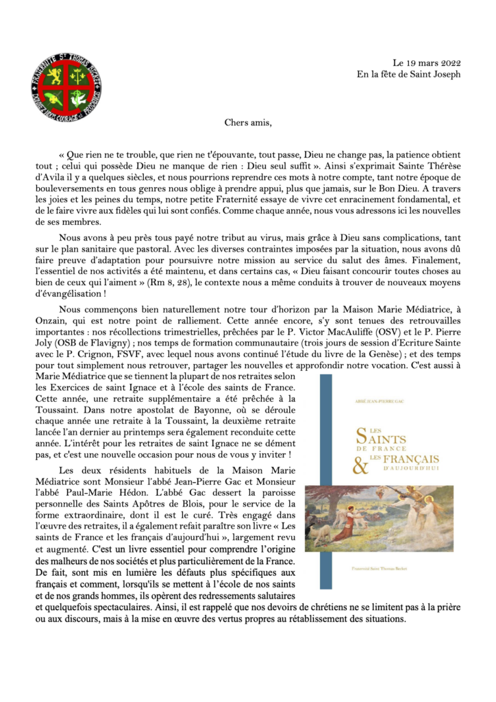 La communauté publie une lettre annuelle avec les nouvelles de ses différents apostolats en France