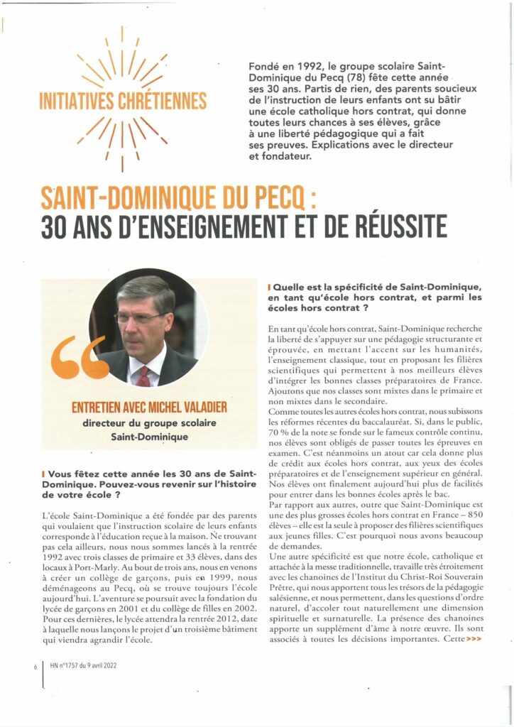 L’Homme Nouveau a interrogé Michel Valladier, un des fondateurs et directeur de l’Ecole Saint-Dominique du Pecq (78). Fondé en 1992, Saint-Dominique compte aujourd’hui plus de 800 élèves (ce qui en fait le plus gros établissement hors contrat), 35 classes de la maternelle au lycée, avec un collège-lycée de garçons et un collège-lycée de filles. Signalons aussi la classe Saint François de Fatima qui accueille des enfants atteints du maladie de l’intelligence. Des prêtres de l’Institut du Christ Roi Souverain Prêtre assurent l’aumônerie de l’établissement. (Soutenir l’Ecole Saint-Dominique du Pecq)