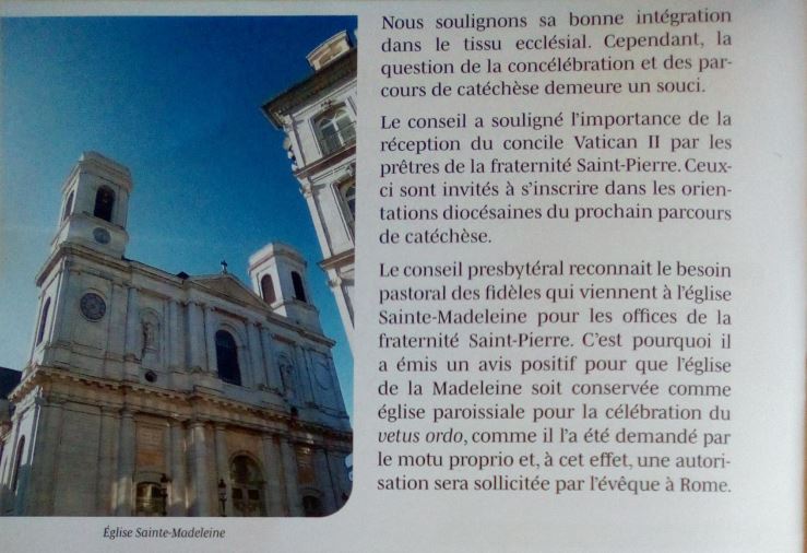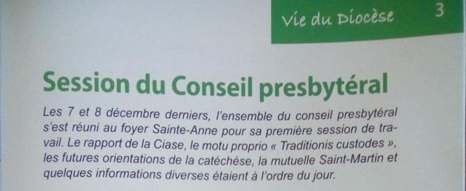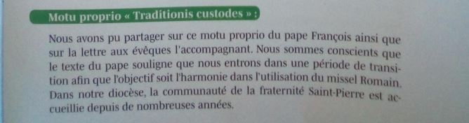 Un lecteur nous adresse la copie de la revue diocésaine de Besançon (n°3, février 2022) dans laquelle est évoquée le Motu Proprio Traditionis Custodes. Le Conseil Presbytéral du diocèse de Besançon s’accorde sur le fait qu’il y a bien un besoin pastoral [NDLR : La communauté est dynamique et nombreuse]. Il indique la bonne intégration des prêtres dans le presbytérium, même si se posent la question de la concélébration et du catéchisme.