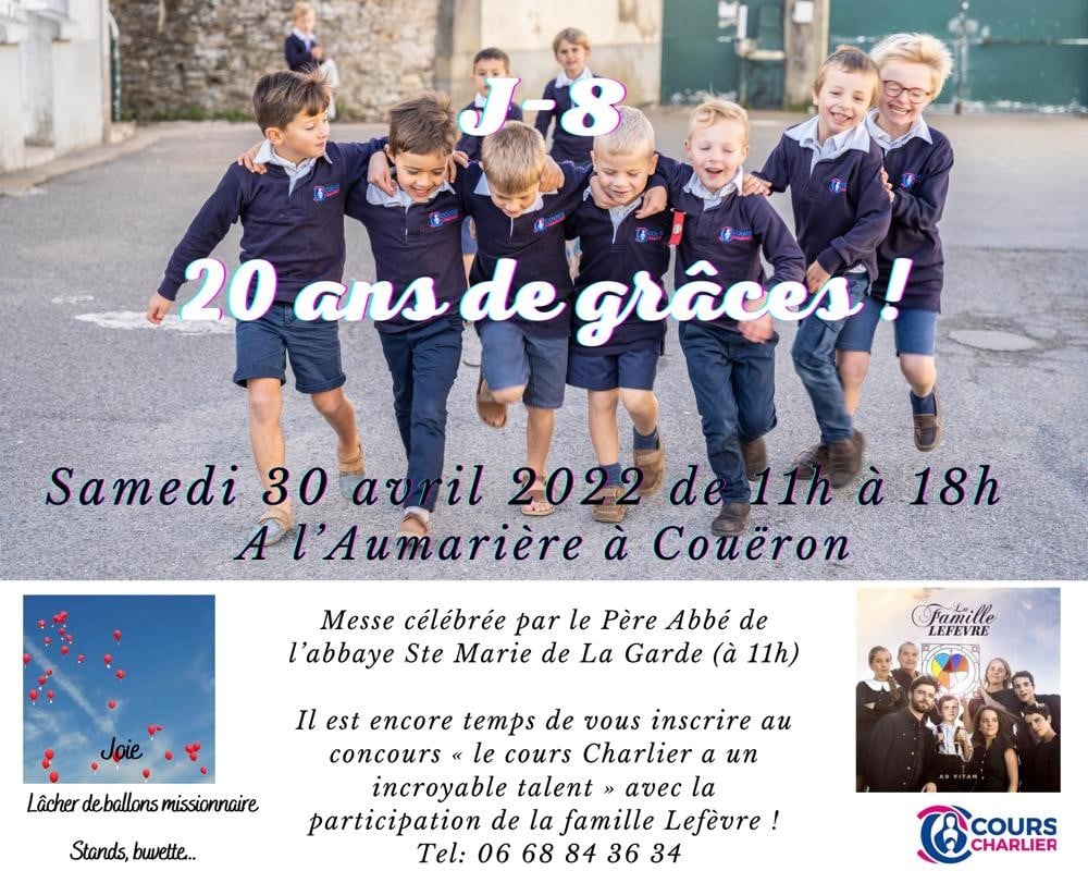 Le Cours Charlier a fêté ses 20 ans il y a quelques mois. Une journée anniversaire est organisée le samedi 30 avril à Couëron (Nantes). Une messe d’action de grâce sera célébrée par le Père Abbé de l’Abbaye Sainte-Marie de La Garde.