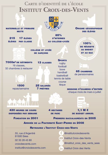 09Fondé il y a 20 ans, l’Institut Croix des Vents compte aujourd’hui près de 215 élèves de la maternelle au lycée. La Fraternité Saint-Pierre assure l’aumônerie et la direction de l’établissement.