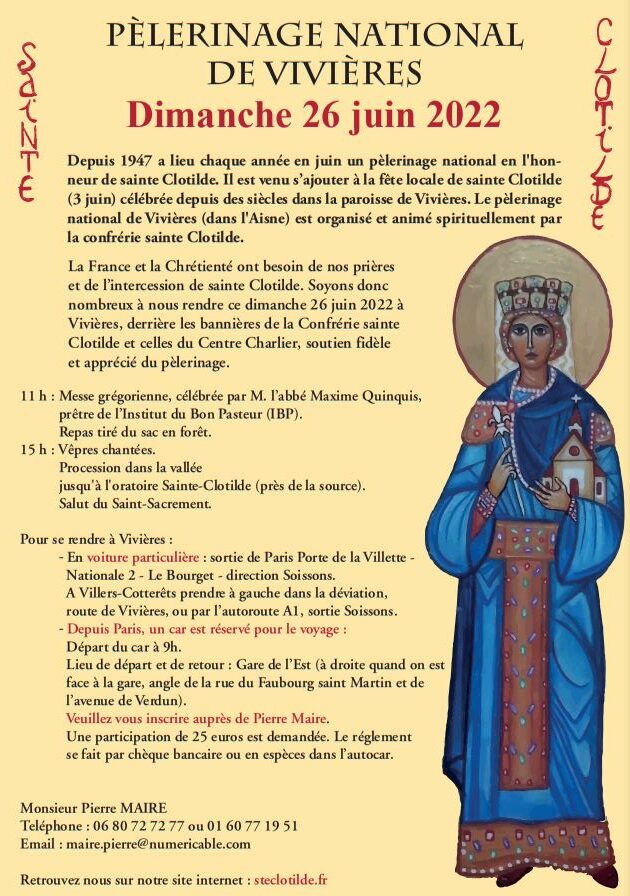 Accueil » Nos archives » 75ème anniversaire du pèlerinage de Vivières (02) le 26 juin Summorum Pontificum 75ème anniversaire du pèlerinage de Vivières (02) le 26 juin Le prochain pèlerinage est fixé au dimanche 26 juin 2022. Nous vous invitons à venir nombreux pour le 75ème anniversaire du pèlerinage. Confrérie Sainte-Clotilde Article précédentGrenoble : des fidèles de Saint André occupent la cathédrale Article suivantAFSAN à la cathédrale de Grenoble : Juventus traditionis réagit 21 mai 2022