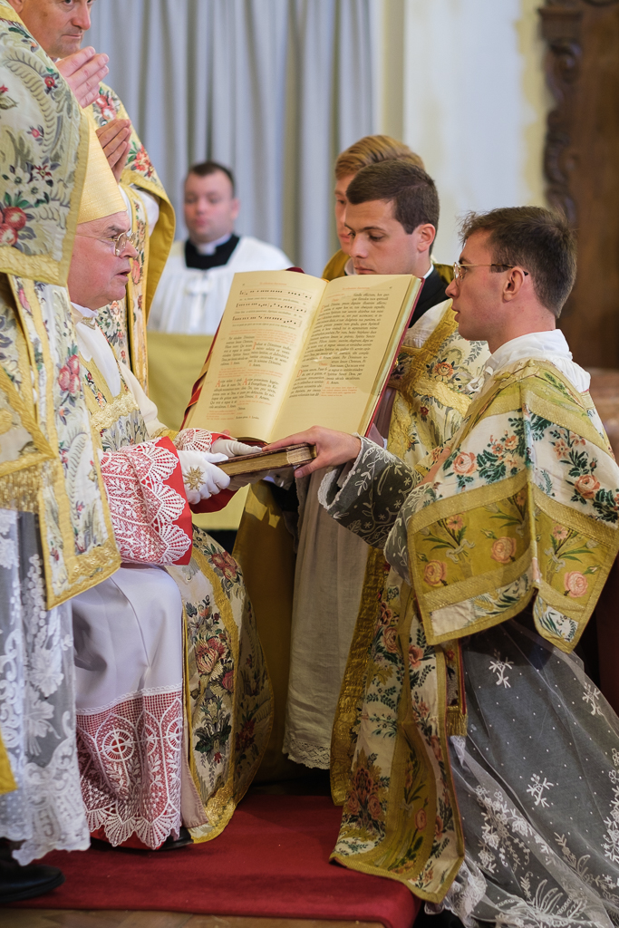 Nous célébrons une heure solennelle. Par l’imposition des mains et la prière, le Seigneur lui-même va conférer le Saint-Esprit aux candidats et les ordonner diacres. Je félicite chaleureusement chacun des candidats au diaconat ainsi que toute la communauté du séminaire Saint-Pierre, avec à sa tête son recteur l’abbé Vincent Ribeton. J’adresse un salut particulier au supérieur de district, l’abbé Stefan Dreher, qui est un vrai Allgäuer, ne serait-ce que par sa bonne maîtrise du dialecte local. Je me réjouis également que le curé de Lindenberg nous ait ouvert les portes de son imposante église St Pierre et Paul : il vous l’a ouverte à vous, chers candidats à l’ordination, qui êtes au nombre de dix, et aussi à moi, évêque d’Augsbourg. Si je ne suis pas (encore) tout à fait sûr de moi dans la célébration selon le Pontificale Romanum en vigueur en 1961-62, je vous prie d’excuser ma faiblesse. Nous sommes tous liés par la grande préoccupation qui inspirait saint Ignace de Loyola : Omnia ad maiorem Dei gloriam. Tout pour la plus grande gloire de Dieu.