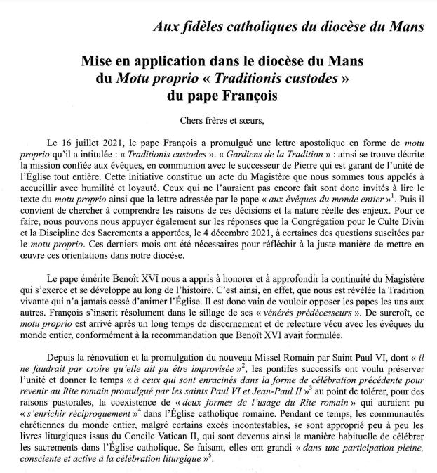 Mgr Yves le Saux, évêque du Mans, vient de publier un long texte annonçant la mise en application du Motu Proprio Traditionis custodes du Pape François dans son diocèse.