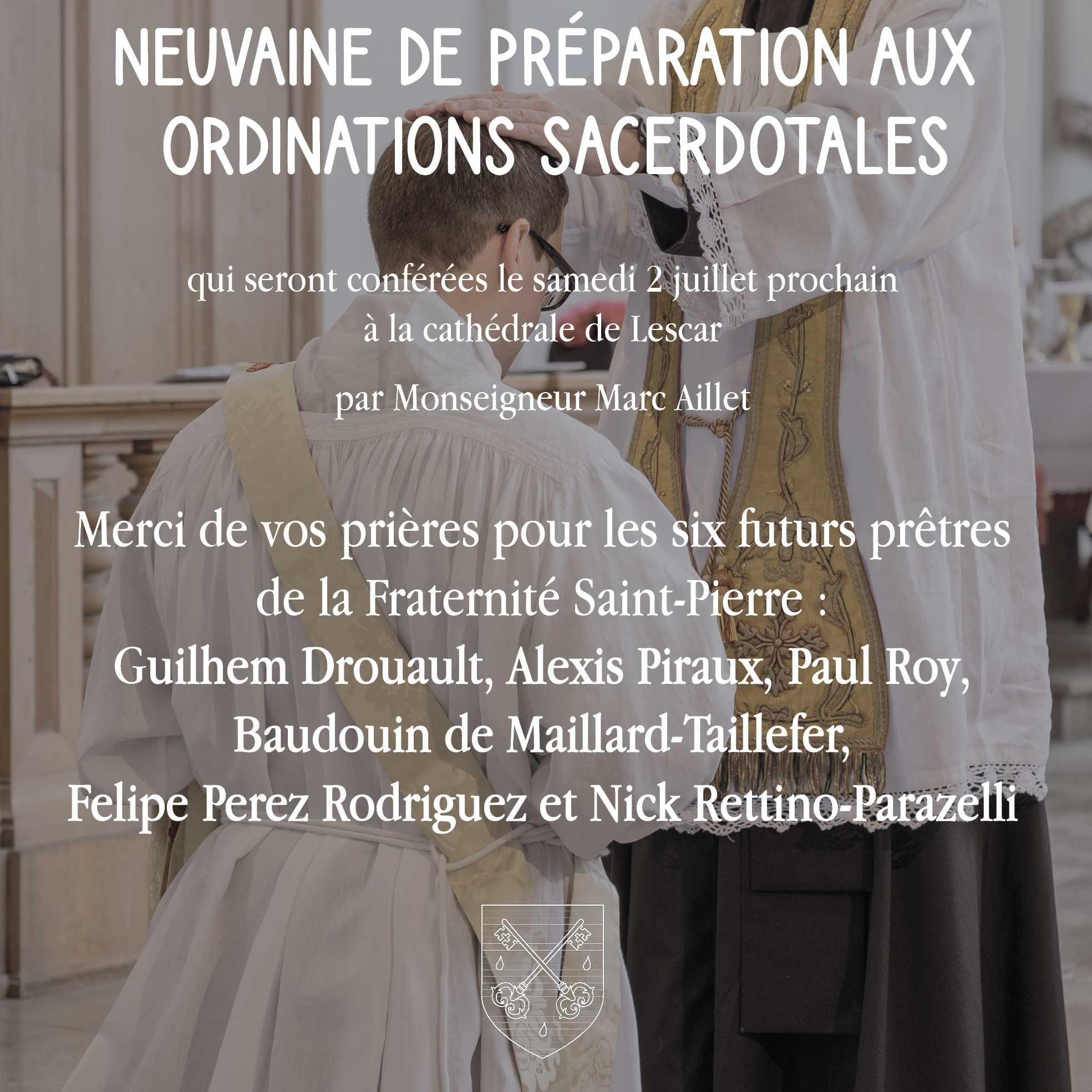 Accueil » Nos archives » Neuvaine pour les ordinations (FSSP) Summorum Pontificum Neuvaine pour les ordinations (FSSP) Samedi 2 juillet à Lescar, Mgr Aillet ordonnera 6 prêtres pour la Fraternité Saint-Pierre. La FSSP propose se joindre à une neuvaine pour les futurs prêtres. Fraternité Saint-Pierre (District de France) Article précédentLe pouvoir de l’évêque délégué à des femmes Article suivantBrève: Une visite de l'abbaye Sainte Madeleine (Le Barroux) le 2 juillet 27 juin 2022