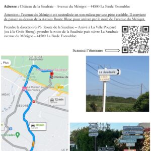 Mieux situé sur le plan routier – et pour se garer – que la chapelle de Pornichet, le château de la Sauldraye est au nord-est du bourg d’Escoublac près de la sortie Escoublac de la route Bleue. La FSSPX publie cependant un schéma pour s’y rendre, l’accès direct – l’avenue du Ménigot – étant encombré par une piste cyclable et plutôt étroit, surtout sous la route Bleue et à suivre.