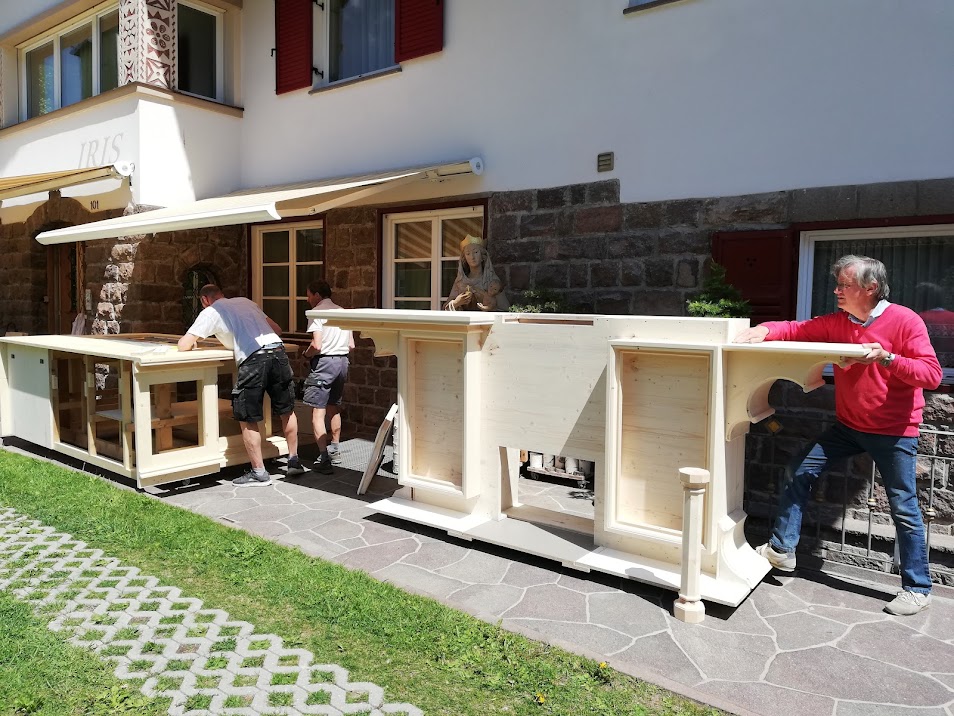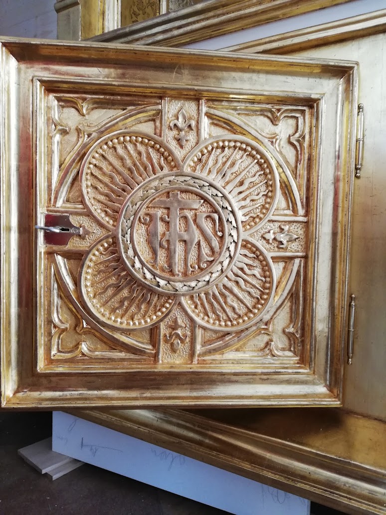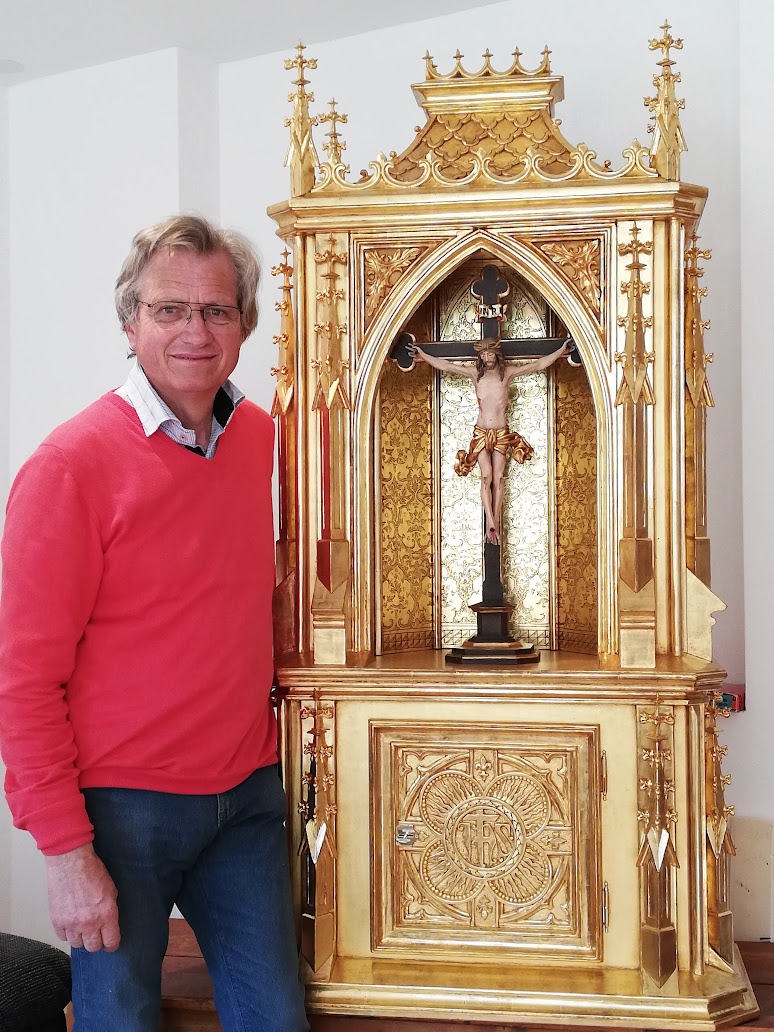 Depuis début janvier, M. Insam et les autres artisans du village de Sankt-Ulrich (Tyrol du Sud) se sont mis à l’ouvrage et avancent à belle allure. Tous catholiques pratiquants, ils mettent beaucoup de foi et de cœur pour ce chantier exceptionnel et en parlent souvent à l’issue de la messe dominicale. Ainsi M. Insam a spontanément ajouté la dorure-gravure à l’intérieur du tabernacle (personne ne la verra !), qu’il a tenu à offrir gratis pro Deo. Il est vrai que cet autel a une signification toute particulière pour ce fils d’une vieille dynastie de sculpteurs d’autels, car il sera sa dernière œuvre avant la retraite et, de son propre aveu, « le plus bel autel de sa carrière ».