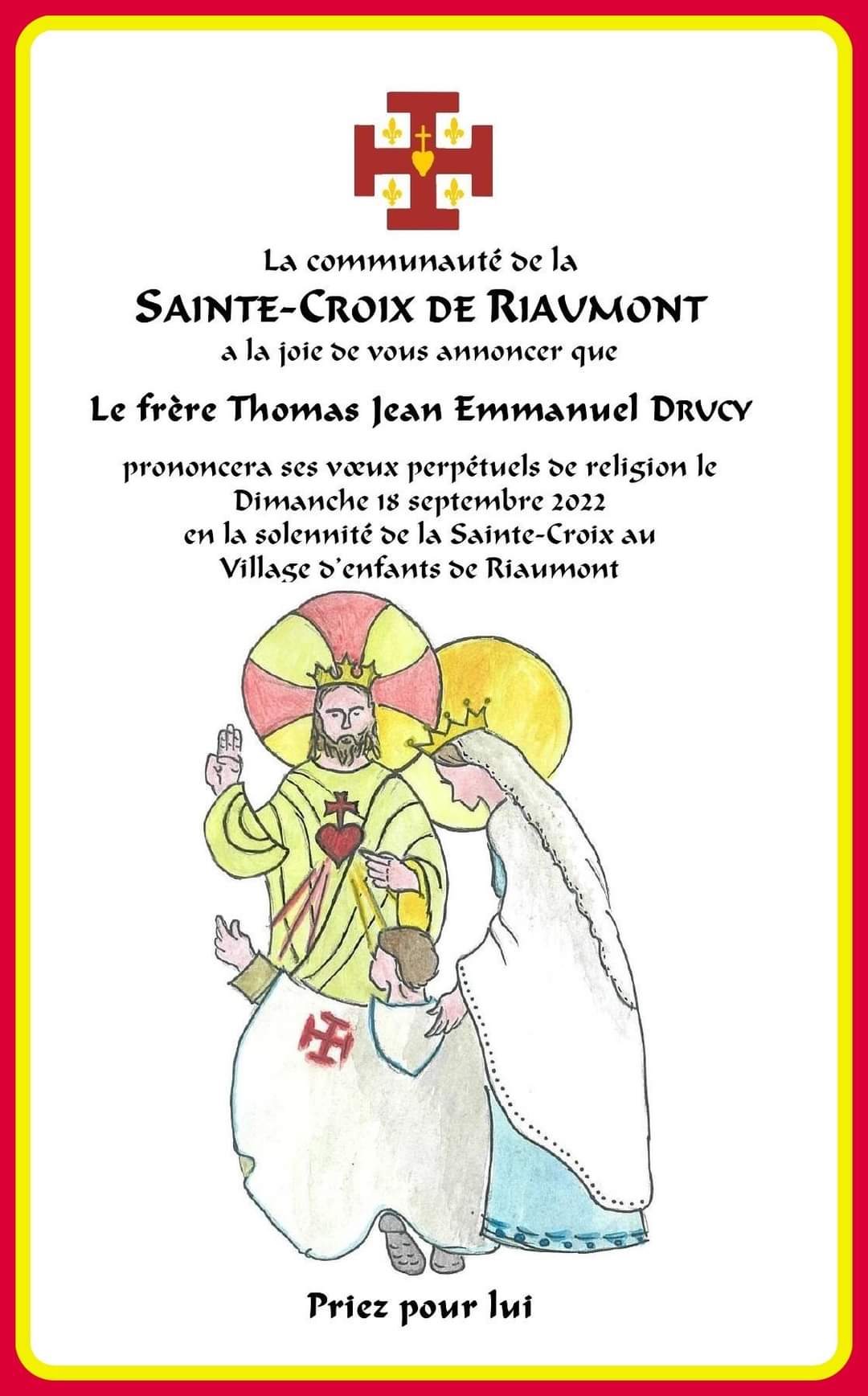 Accueil » Nos archives » Voeux perpétuels à Riaumont le 18 septembre Summorum Pontificum Voeux perpétuels à Riaumont le 18 septembre En la solennité de la Sainte-Croix le frère Thomas Drucy prononcera ses voeux perpétuels au sein de la communauté de la Sainte-Croix de Riaumont. Institut de la Sainte-Croix de Riaumont Article précédentItalie : une église du XVIIe à vendre à Morimondo (Lombardie) Article suivantSaint Jean-Marie Vianney priez pour les prêtres 8 août 2022
