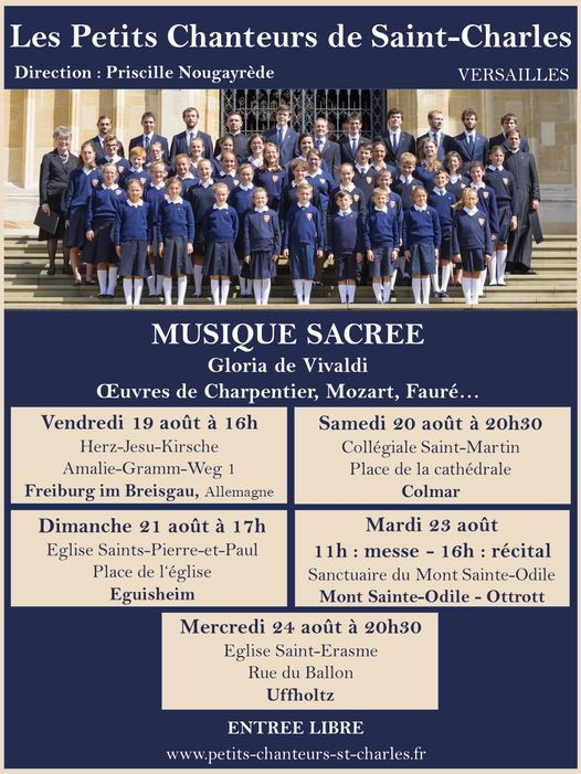 Les petits chanteurs de Saint-Charles de Versailles sont nés au mois de septembre 1983. Fondés par le Père Morandi S.M., ils ont à coeur d’imiter les manécanteries qui, dans le passé, ont magnifiquement rayonné la musique sacrée. Ils chantent une fois par mois une messe dominicale de la Paroisse Notre-Dame des Armées (Versailles) et font plusieurs concerts en région parisienne chaque année. Les petits chanteurs seront en Alsace ces jours-ci.