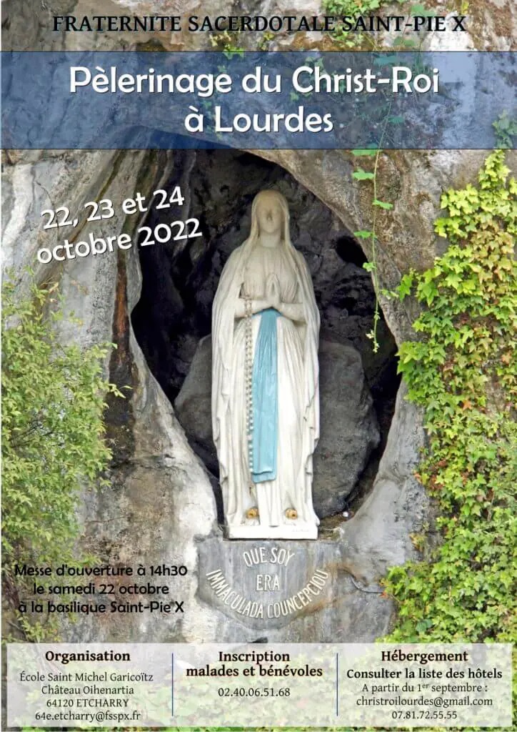 Accueil » Nos archives » Pèlerinage international du Christ-Roi à Lourdes (Octobre 2022) Summorum Pontificum Pèlerinage international du Christ-Roi à Lourdes (Octobre 2022) Les 22, 23 et 24 octobre 2022 se tiendra à Lourdes le pèlerinage international du Christ-Roi organisé par la Fraternité Saint-Pie X. Renseignements (La Porte Latine) Article précédentLe Mesnil en Ouche : une association sauve l'ancienne église Saint-Ouen de Rubremont Article suivantEn mémoire de l'abbé Chanut 18 août 2022
