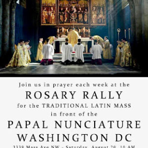 Alors que plusieurs évêques américains ont supprimé ou restreint l’usage du missel traditionnel, les catholiques attachés à l’usus antiquior ont décidé d’organiser la récitation d’un rosaire par semaine devant la Nonciature apostolique à Washington. Un rosaire a été dit ce samedi matin. Cette initiative s’inscrit dans les différentes mobilisations des fidèles des deux côtés de l’Atlantique. Des prières avaient déjà été dites le 8 août dernier devant la cathédrale de Chicago. Une page Facebook a même été créée pour communiquer sur cet événement hebdomadaire. La mobilisation contre l’extinction du rite traditionnel se renforce donc aux Etats-Unis.