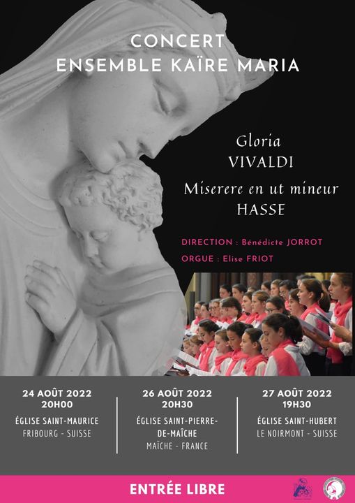 Accueil » Nos archives » Agenda: L’Ensemble Kaïre Marie en Suisse et dans le Jura Summorum Pontificum Agenda: L’Ensemble Kaïre Marie en Suisse et dans le Jura L’Ensemble Kaïra Maria (choeur de jeunes filles de l’Ecole Saint-Dominique du Pecq) chantera ces jours-ci en Suisse et dans le Jura : Ensemble Kaïre Maria (Saint-Dominique) Article précédentNominations 2022 dans le diocèse de Belley-Ars Article suivantLe cardinal Angelo Becciu sera présent au prochain Consistoire 24 août 2022