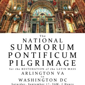 Le pèlerinage national Summorum Pontificum pour la restauration de la messe latine traditionnelle commencera à la cathédrale de St. Thomas More, Arlington, VA, et se terminera à la cathédrale de St. Matthew the Apostle, Washington, DC, une distance d’environ 5 miles (durée prévue 2 heures).La date a été choisie à la fois parce que le samedi 17 septembre 2022 est le samedi le plus proche du 15e anniversaire de l’entrée en vigueur du Summorum Pontificum, le motu proprio du pape Benoît XVI qui a libéré la messe latine traditionnelle pour tous les catholiques de rite latin, et parce que les restrictions dans les deux diocèses entrent en vigueur en septembre (le 8 pour Arlington, le 21 pour DC).En réponse aux restrictions cruelles et injustes imposées à la célébration de l’usus antiquior dans l’archidiocèse de Washington et le diocèse d’Arlington, ainsi que dans de nombreux autres endroits du monde, nous irons en pèlerinage dans un acte public de tristesse à l’égard de la destruction du patrimoine liturgique occidental, et à l’appui de sa restauration complète et immédiate.