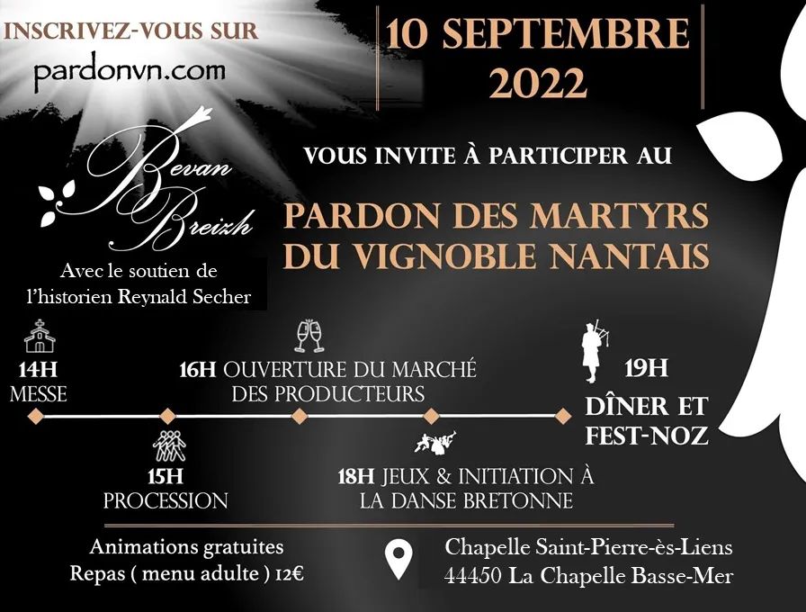 Accueil » Nos archives » Pardon des Martyrs du Vignoble Nantais à la Chapelle Basse-Mer le samedi 10 septembre Summorum Pontificum Pardon des Martyrs du Vignoble Nantais à la Chapelle Basse-Mer le samedi 10 septembre Le 10 septembre, l’association Bevan Breizh organise un pardon des Martyrs du Vignoble Nantais au Prieuré Saint Pierre ès Liens de la Chapelle Basse-Mer (44). Renseignements et inscriptions sur : https://pardonvn.com Article précédentÉtats-Unis: pèlerinage d’Arlington a Washington pour la défense de la messe traditionnelle Article suivantInculture religieuse : le Courrier de l'ouest mérite un prix 29 août 2022