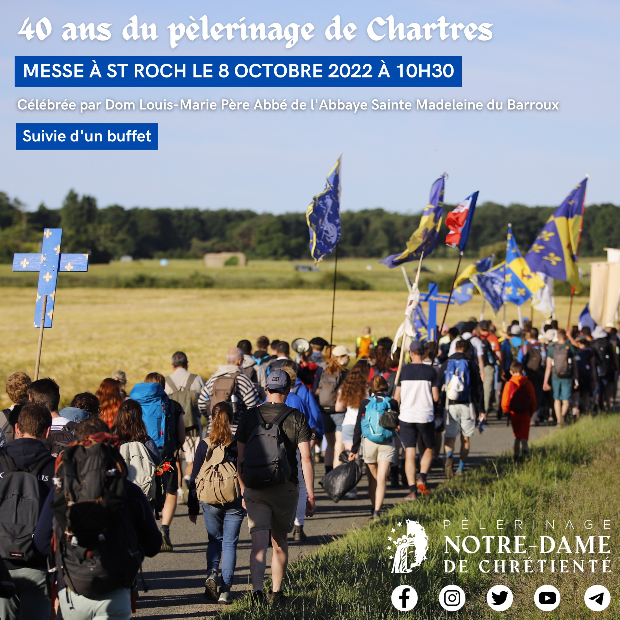 Accueil » Nos archives » 40 ans de Notre-Dame de Chrétienté à Paris le 8 octobre Summorum Pontificum 40 ans de Notre-Dame de Chrétienté à Paris le 8 octobre Notre-Dame de Chrétienté fête le 40ème anniversaire du Pèlerinage de Chartres le samedi 8 octobre : Messe célébrée par Dom Louis-Mare de Geyer, abbé de l’Abbaye Sainte-Madeleine du Barroux, à l’église Saint-Roch (Paris) à 10h30 Suivie d’un buffet Article précédentLa communauté Saint-Martin s'installe au Mont-Saint-Michel Article suivantNomination de Mgr Jean-Marc Eychenne comme évêque de Grenoble 14 septembre 2022
