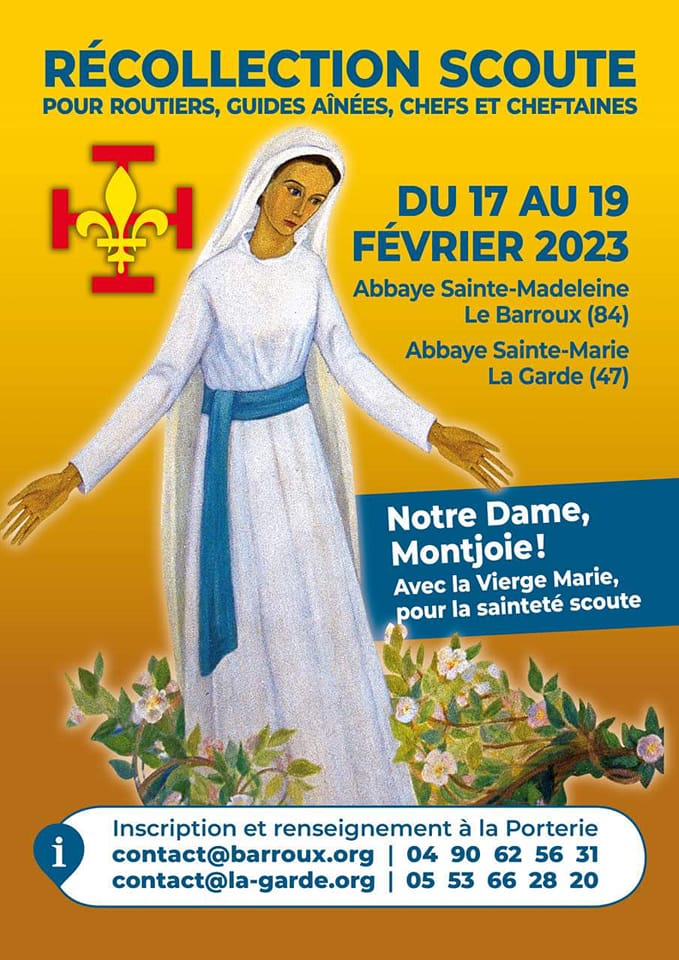 Les récollections scoutes pour routiers, guides-aînées, chefs et cheftaines auront lieu du 17 au 19 février 2023 à l’Abbaye Sainte-Madeleine (Le Barroux – 84) et à l’Abbaye Sainte-Marie de la Garde (Saint-Pierre de Clairac – 47).