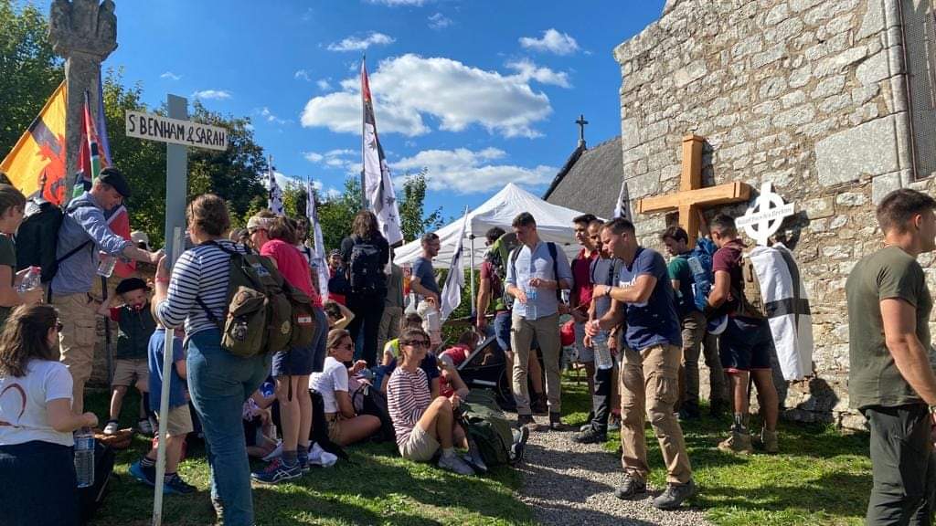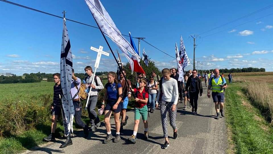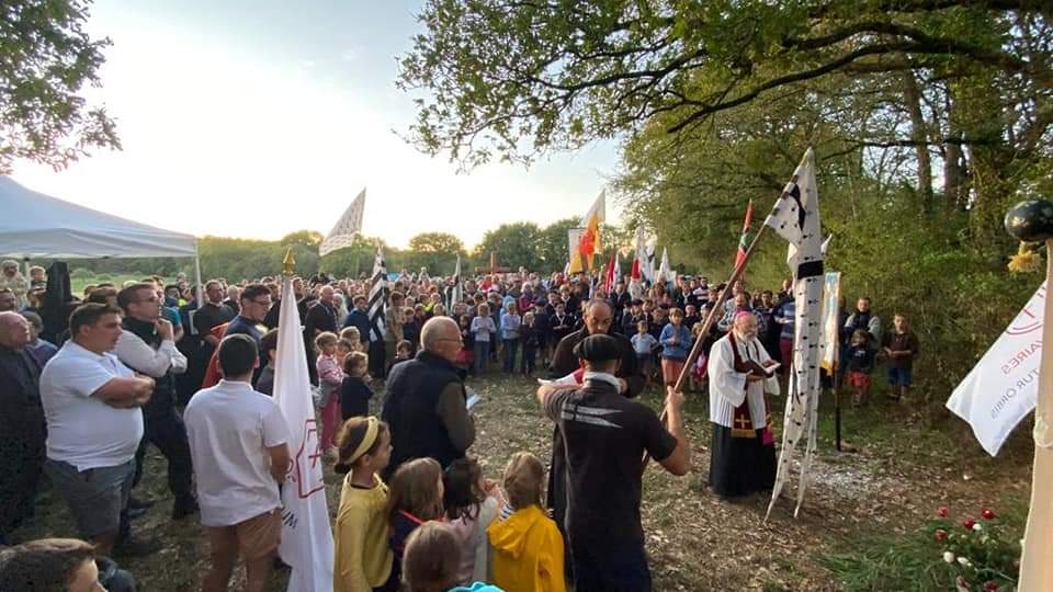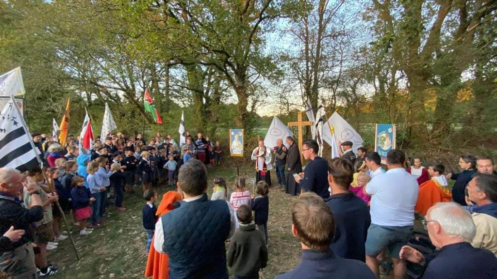 Le 5è Pèlerinage Feiz e Breizh est parti ce samedi de Guénin à l’issue de la messe d’envoi. Les 450 pèlerins ont pris le chemin de Bieuzy-Lanvaux pour 28 km de marche. A l’arrivée au bivouac, Mgr Centene, évêque de Vannes, les accueillait et bénissait un calvaire érigé par SOS Calvaire.