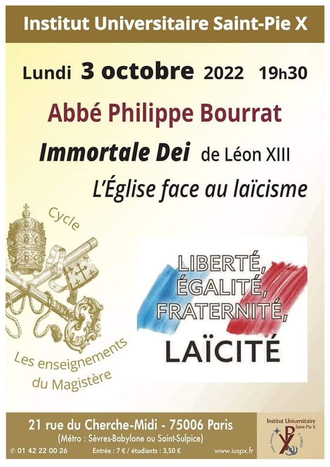 Accueil » Nos archives » Une conférence sur le laïcisme ce lundi à Paris Summorum Pontificum Une conférence sur le laïcisme ce lundi à Paris L’Institut Universitaire Saint-Pie X propose une conférence sur le laïcisme ce lundi 3 octobre. Article précédentAgenda : Marche de Riaumont à Amettes (62) les 8 et 9 octobre Article suivantUn miracle méconnu de Sainte Thérèse de l'Enfant Jésus 3 octobre 2022