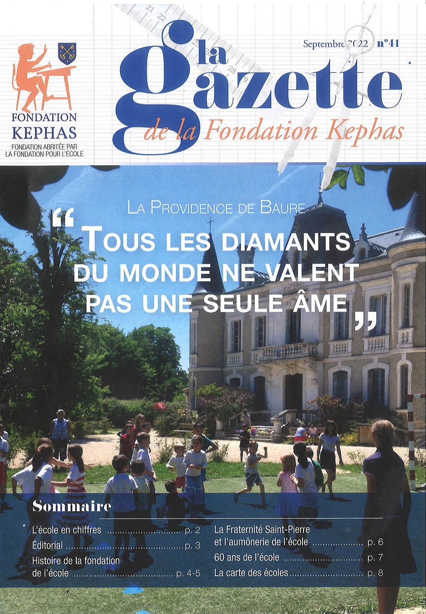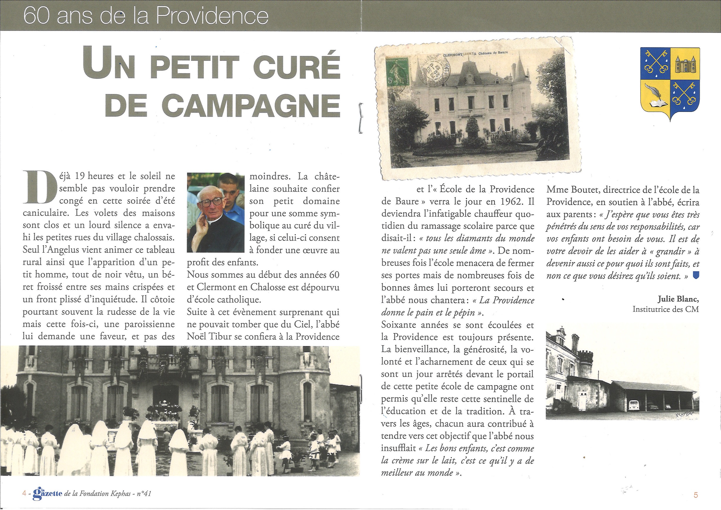 Dans la dernière Gazette de la Fondation Kephas (n°41, Septembre 2022), la Fraternité Saint-Pierre évoque l’Ecole de la Providence de Baure de Clermont en Chalosse (40) fondée en 1962, il y a 60 ans, par l’abbé Noël Tibur, curé de la Paroisse jusqu’en 2003.