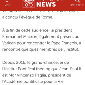 La rencontre entre le Pape François et Emmanuel Macron a eu lieu hier. Ils ont échangé pendant moins sur différents sujets, dont celui de l’euthanasie, le président français se refusant à employer ce dernier terme: « la mort, c’est un moment de vie, pas un acte technique », aurait déclaré ainsi Emmanuel Macron. On apprend aussi que le Pape a demandé à Brigitte Macron de prier pour lui. Réponse de Brigitte Macron au Pape: « Je prie pour vous, je prie pour vous tous les jours. » Hasard du calendrier, Emmanuel Macron a aussi croisé les membres de l’Institut Jean-Paul II pour la famille qui a été sérieusement recentré pour porter les nouvelles « orientations » pastorales (l’Institut est ainsi prié de prendre en compte Amoris Laetitia). Les membres de cet institut avaient été en effet reçus par le Pape lundi matin. Bref, comme disait Emmanuel Macron, il suffit de traverser la rue…