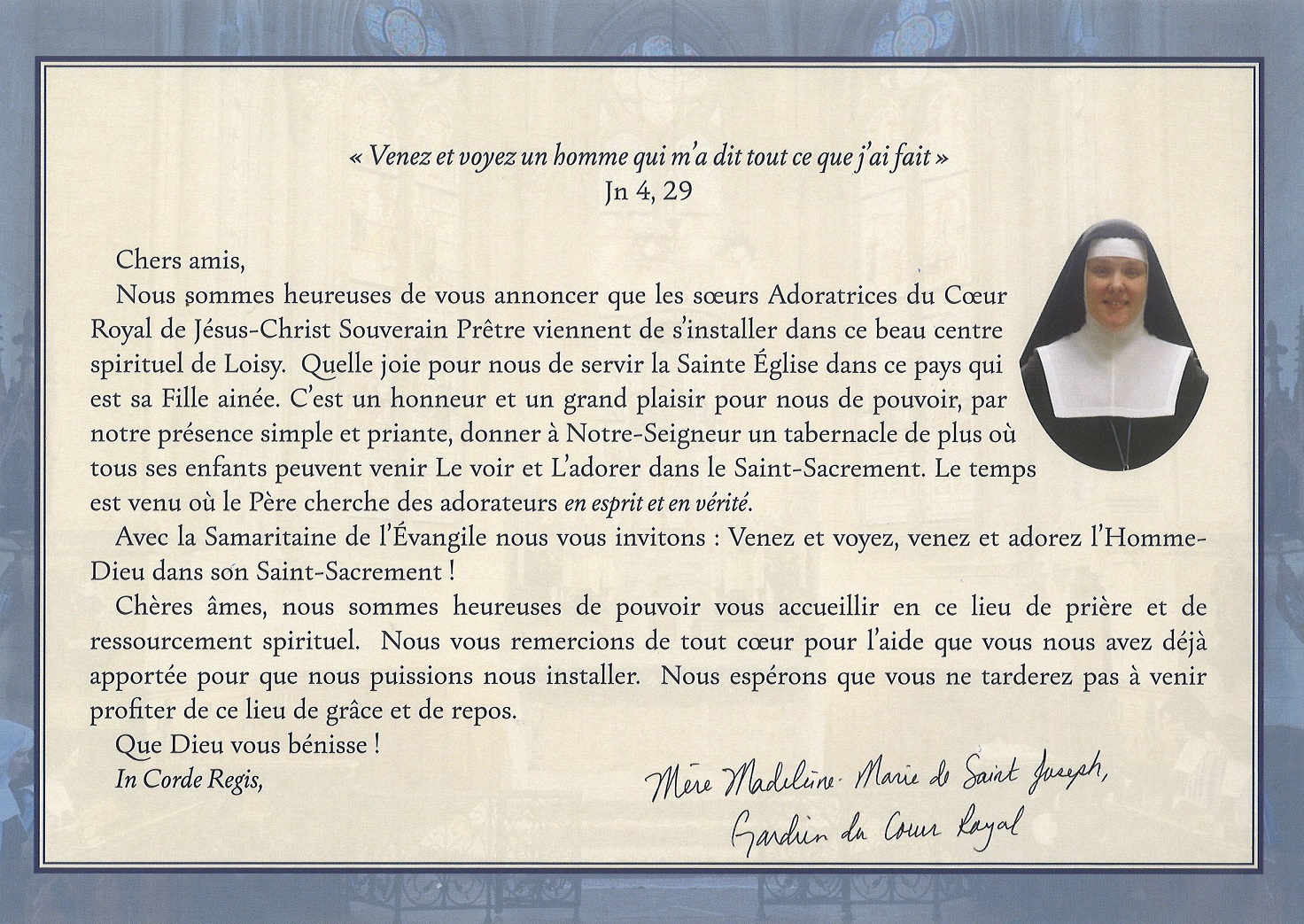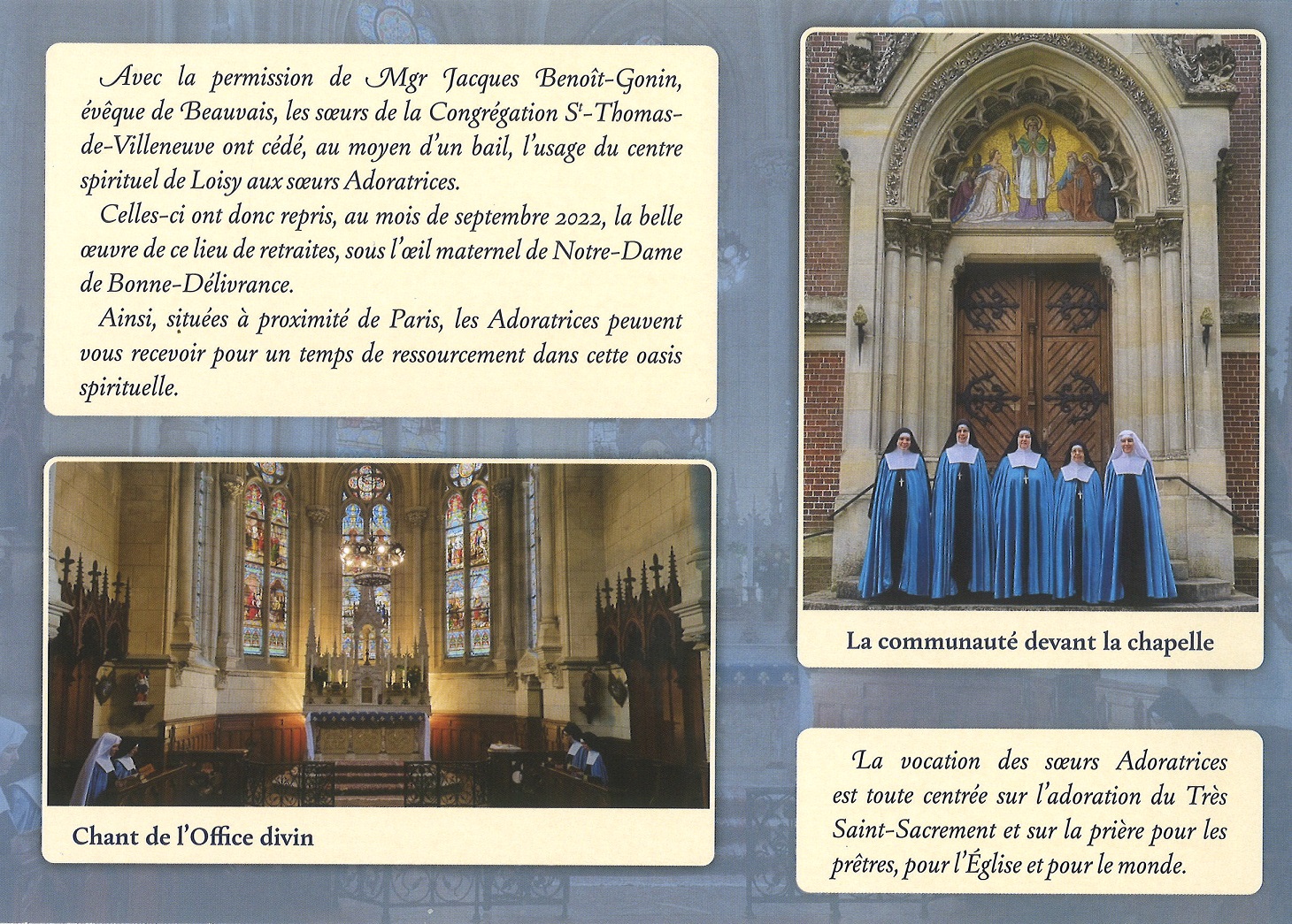 Accueil » Nos archives » Les Adoratrices du Coeur Royal ont besoin de vous Summorum Pontificum Les Adoratrices du Coeur Royal ont besoin de vous Les Adoratrices du Coeur Royal sont installées dans leur maison de Loisy (Oise) depuis le début du mois de septembre. Plusieurs retraites y sont déjà programmées. Les Adoratrices ont besoin de vous ! Adoratrice du Coeur Royal Article précédentLe père jésuite Gaël Giraud morigéné par son ordre Article suivantAffaire Santier : la communauté Réjouis-toi se résout à communiquer 29 octobre 2022