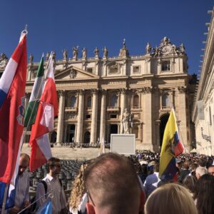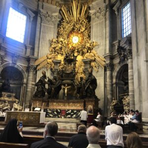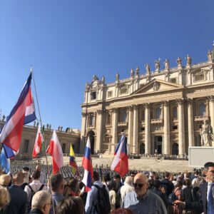 Les pèlerins du Pèlerinage Ad Petri Sedem sont arrivés en fin de matinée à la basilique Saint-Pierre de Rome, après avoir entonné des chants, dont celui du credo, dans le sillage de la procession débutée a l’église Saint-Celse et Saint-Julien (ICRSP) face au château Saint Ange.