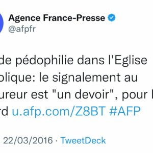 @Teddy, je ne sais pas si ce message de la TSVM est authentique ou non mais peu importe, nous avons la responsabilité de sortir les poubelles et de faire le grand ménage. Exigeons la vérité de nos évêques n’oublions pas les supérieurs de nos instituts traditionnels. L’abbé Raffray s’était associé au mouvement et je pense qu’il avait raison. Aujourd’hui même, l’acte d’accusation d’un prêtre de la FSSPX est sorti dans la presse catholique américaine (https://www.churchmilitant.com/news/article/sspx-priest-charged-with-child-sex-crimes). Ses supérieurs n’avaient rien dit à personne et je ne vois toujours aucune annonce ou communiqué pour l’instant. L’oeuvre de Mgr Lefebvre est en train de s’autodétruire par orgueil et par bêtise, c’est vraiment triste.