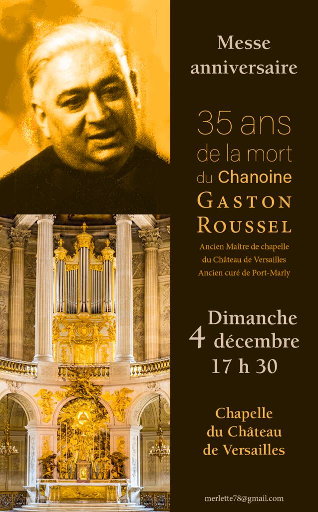 A l’occasion du 37è anniversaire du rappel à Dieu de Chanoine Gaston Roussel (+ 19 décembre 1985), une messe traditionnelle sera célébrée à son intention à la Chapelle Royale du Château de Versailles le dimanche 4 décembre à 17h30.