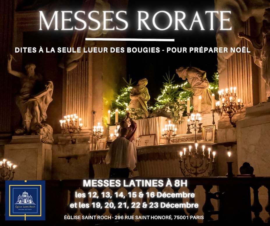 Un lecteur nous informe que des messes traditionnelles dites de Rorate (éclairées à la bougies) sont célébrées les prochains jours de semaine à 8h00 à la Paroisse Saint-Roch (Paris).