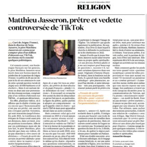 La Croix consacre un article au prêtre hérétique Matthieu Jasseron, toujours de la paroisse de Joigny, avec 18 000 habitants et 15 clochers, dans le diocèse de Sens-Auxerre dirigé par Mgr Hervé Giraud. Comptant plus d’un million d’abonnés sur TikTok, il affirme que le diable n’existe pas ou encore que l’homosexualité n’est pas un péché. En août 2021, la Conférence des évêques de France avait pris timidement ses distances. Et le curé se défend :