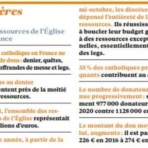La fin de l’article insiste sur cette inquiétude : « localement, les diocèses ébranlés par les affaires peuvent toutefois en subir les conséquences. L’Eglise de Bordeaux, secouée par la mise en cause de son évêque émérite le cardinal Ricard, accuse à ce stade une baisse de 12% du nombre de donateurs, mais là encore la situation n’est pas jugée catastrophique, car le rattrapage se fera sans doute en décembre« .