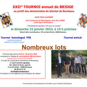 « La réduction du nombre de séminaristes sur le diocèse de Bordeaux et les diocèses voisins a entraîné en 2019 la fermeture du séminaire de Bordeaux. Les six séminaristes du diocèse de Bordeaux sont en formation à Toulouse, Paris et Rome, et leur formation a besoin plus que jamais du soutien moral et financier des diocésains. C’est ce qui a motivé l’organisation de la 22ème édition du tournoi de Bridge au profit des séminaristes, qui aura lieu dimanche 15 janvier 2023« .
