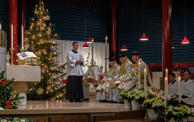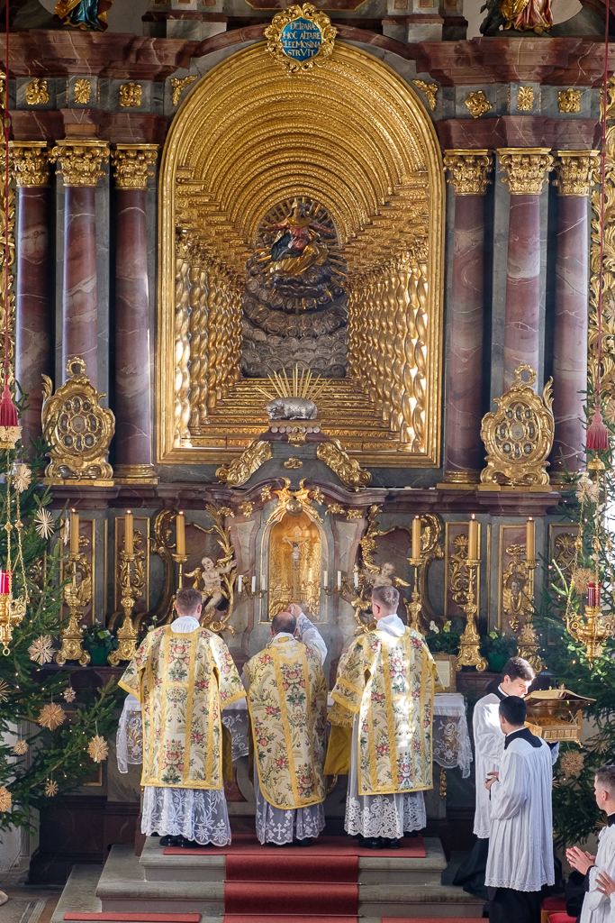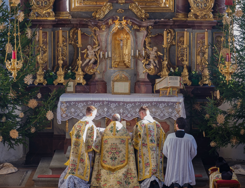 Le Séminaire Saint-Pierre, séminaire européen de la Fraternité Saint-Pierre, a célébré Noël dans la chapelle du séminaire (pour les matines), dans l’église du sanctuaire de Wigratzbad (pour la messe de Minuit) et dans l’église paroissiale de Maria-Thann (messe du jour).