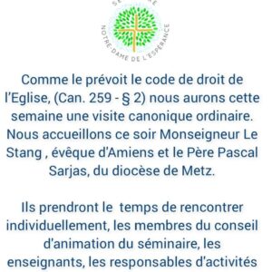 La page Facebook du séminaire d’Orléans informe au sujet d’une visite canonique « ordinaire » au séminaire par Mgr le Stang, évêque d’Amiens, et le père Pascal Sarjas du diocèse de Metz.