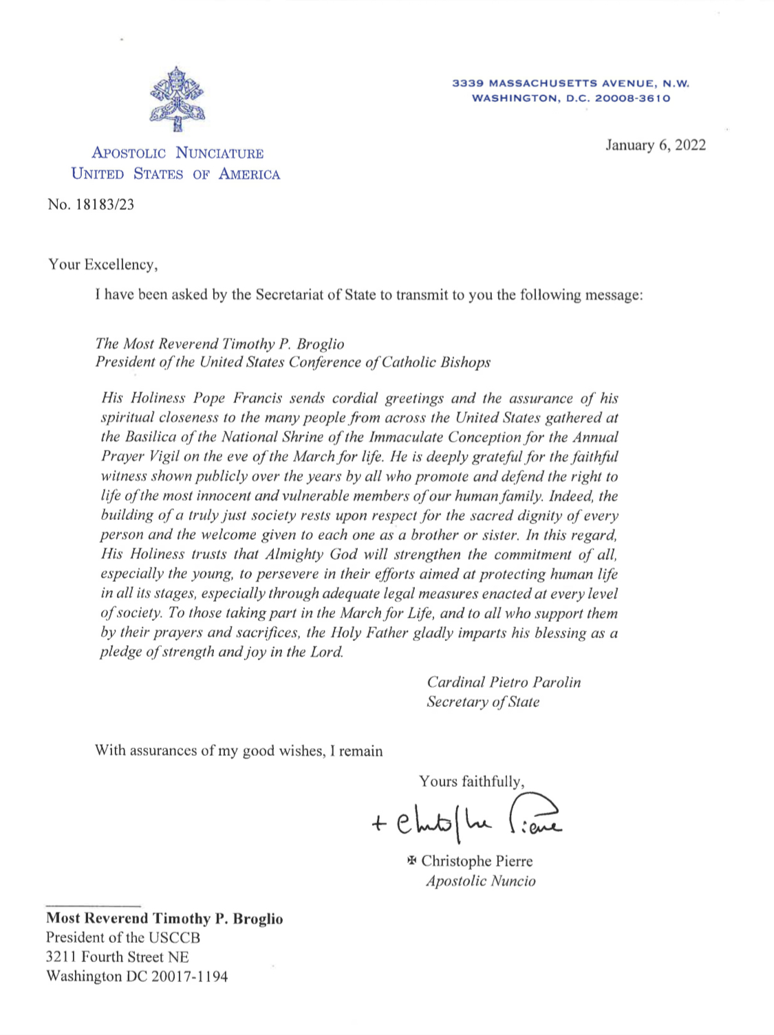 Dans un courrier transmis par le Nonce apostolique à Washington au président de la conférence épiscopale des États-Unis d’Amerique, Mgr Timothy Broglio, un message du cardinal Pietro Parolin, Secrétaire d’État du Saint-Siège, rappelle le soutien du Pape François a la Veillée nationale de prière pour la vie et la Marche pour la vie, qui a eu lieu à Washington le 20 janvier dernier. Le Pape salue ainsi le témoignage des fidèles pour ce combat.