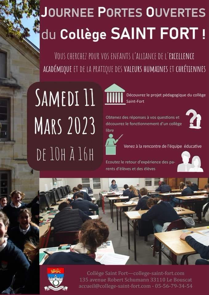 Lancé en septembre 2015, le Collège Saint-Fort situé au Bouscat (Bordeaux) compte aujourd’hui 8 classes et 115 élèves. L’aumônerie du Collège est assurée par l’abbé Guillaume Loddé, FSSP.