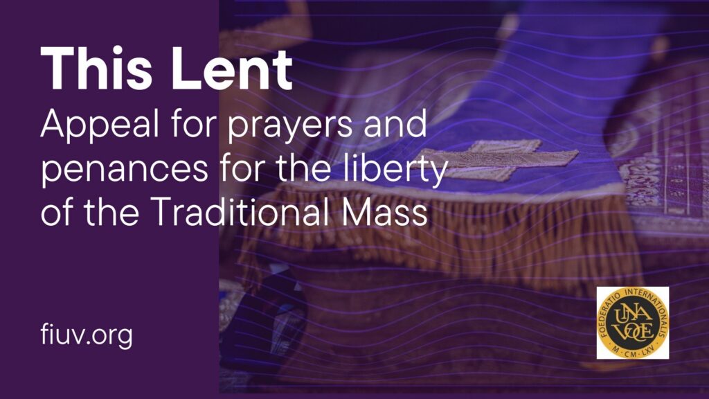 La Fédération Internationale Una Voce (FIUV) et d’autres organisations, groupes et individus concernés par la messe traditionnelle en latin lancent un appel à tous les catholiques de bonne volonté pour qu’ils offrent des prières et des pénitences pendant le Temps du Carême, à l’intention de la liberté de la messe traditionnelle.