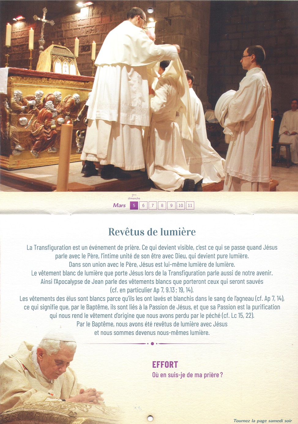 Accueil » Nos archives » Calendrier de Carême et du Temps pascal Summorum Pontificum Calendrier de Carême et du Temps pascal Comme les années passées, les Chanoines Réguliers de la Mère de Dieu (Abbaye de Lagrasse) ont publié de Carême avec quelques pensées spirituelles du Pape émérite Benoît XVI et quelques bonnes résolutions jusqu’au dimanche de la Sainte-Trinité. Abbaye Sainte-Marie de Lagrasse Article précédentMutualisation de l'Enseignement catholique des diocèses de Blois et de Tours Article suivantPologne : pélérinage de l'Opus Sacerdotale du 9 au 20 juillet 2023 21 février 2023