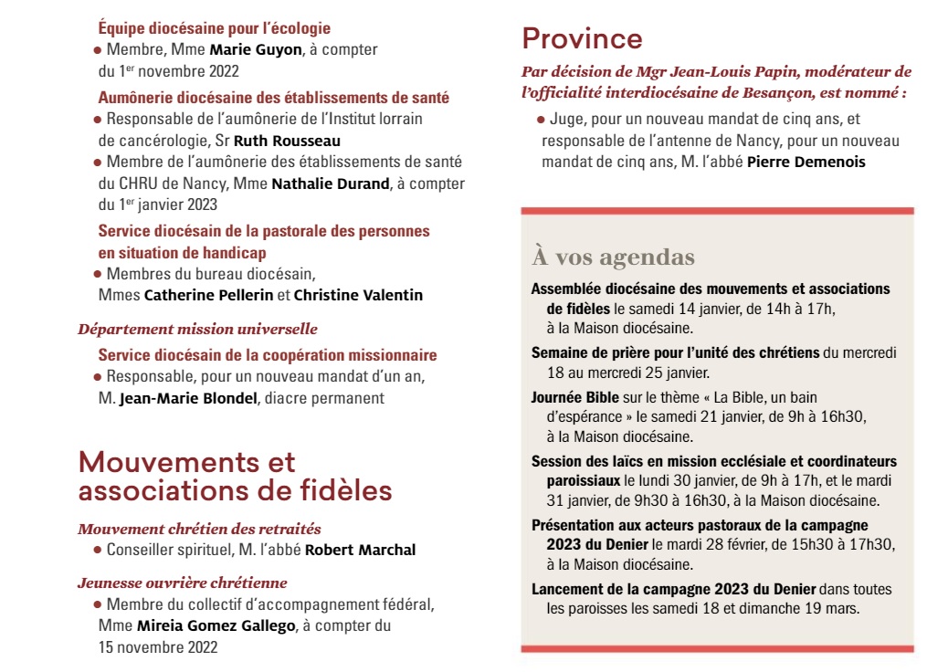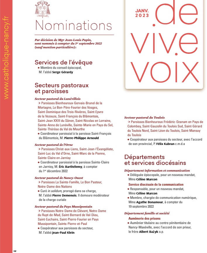 Accueil » Nos archives » Nancy : les nominations du diocèse Informations Nancy : les nominations du diocèse Voici les nominations de janvier 2023 parues dans la revue diocésaine De vive voix : D’autres nominations sont parues en juin 2022 Article précédentPortes ouvertes au Cours Herrade de Landsberg (Strasbourg) le 4 mars Article suivantClub des hommes en noirs : Evangéliser aujourd'hui 4 mars 2023