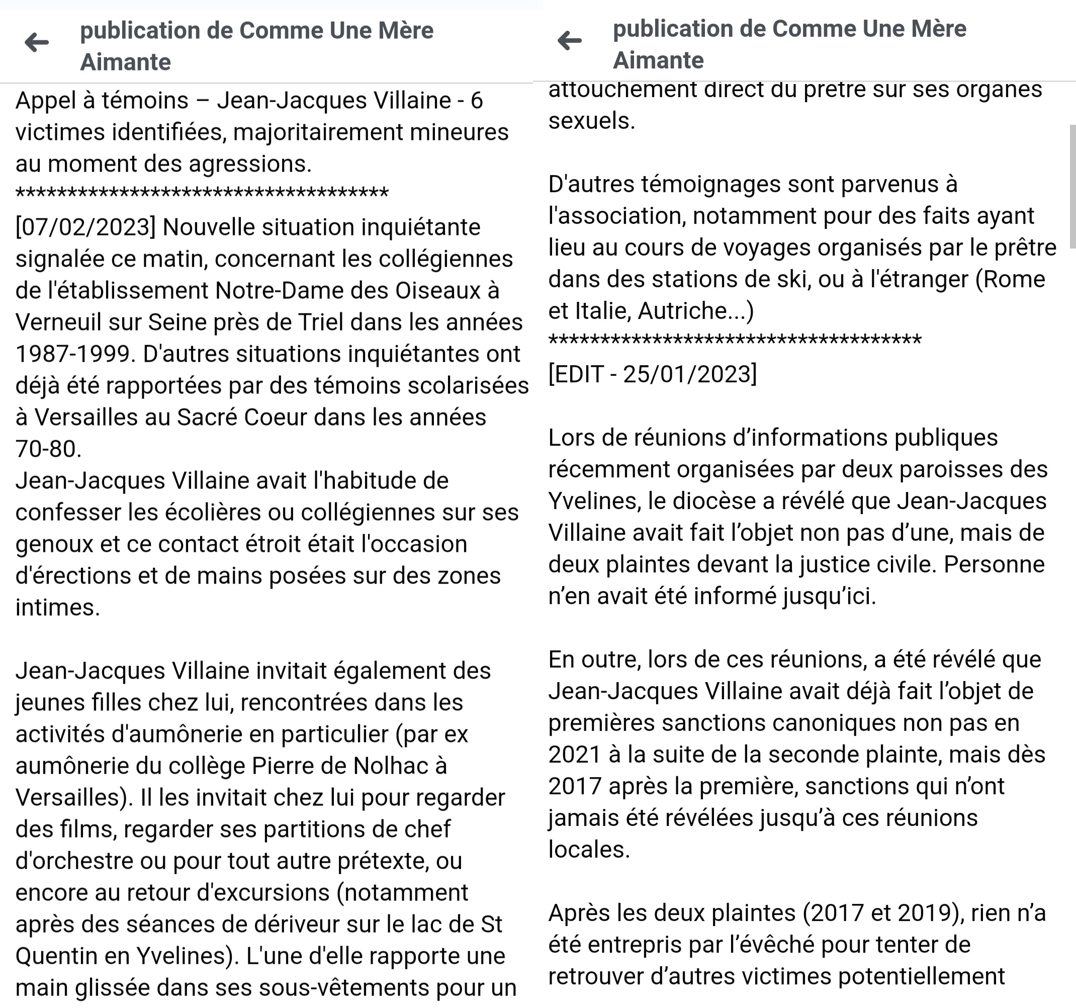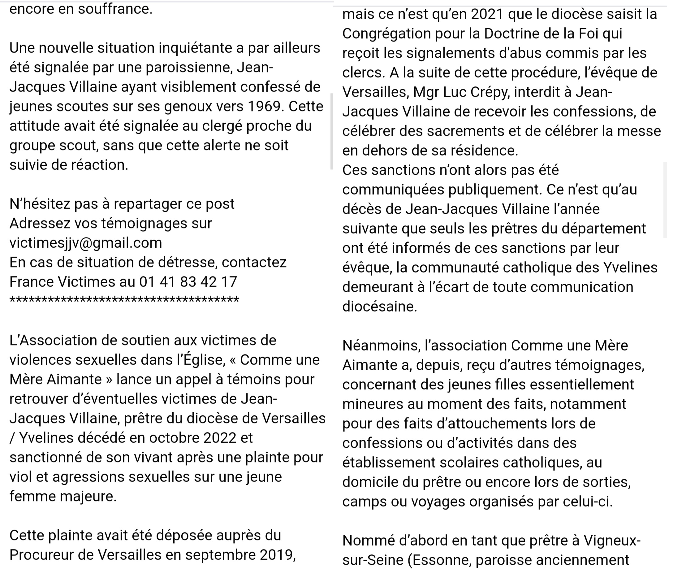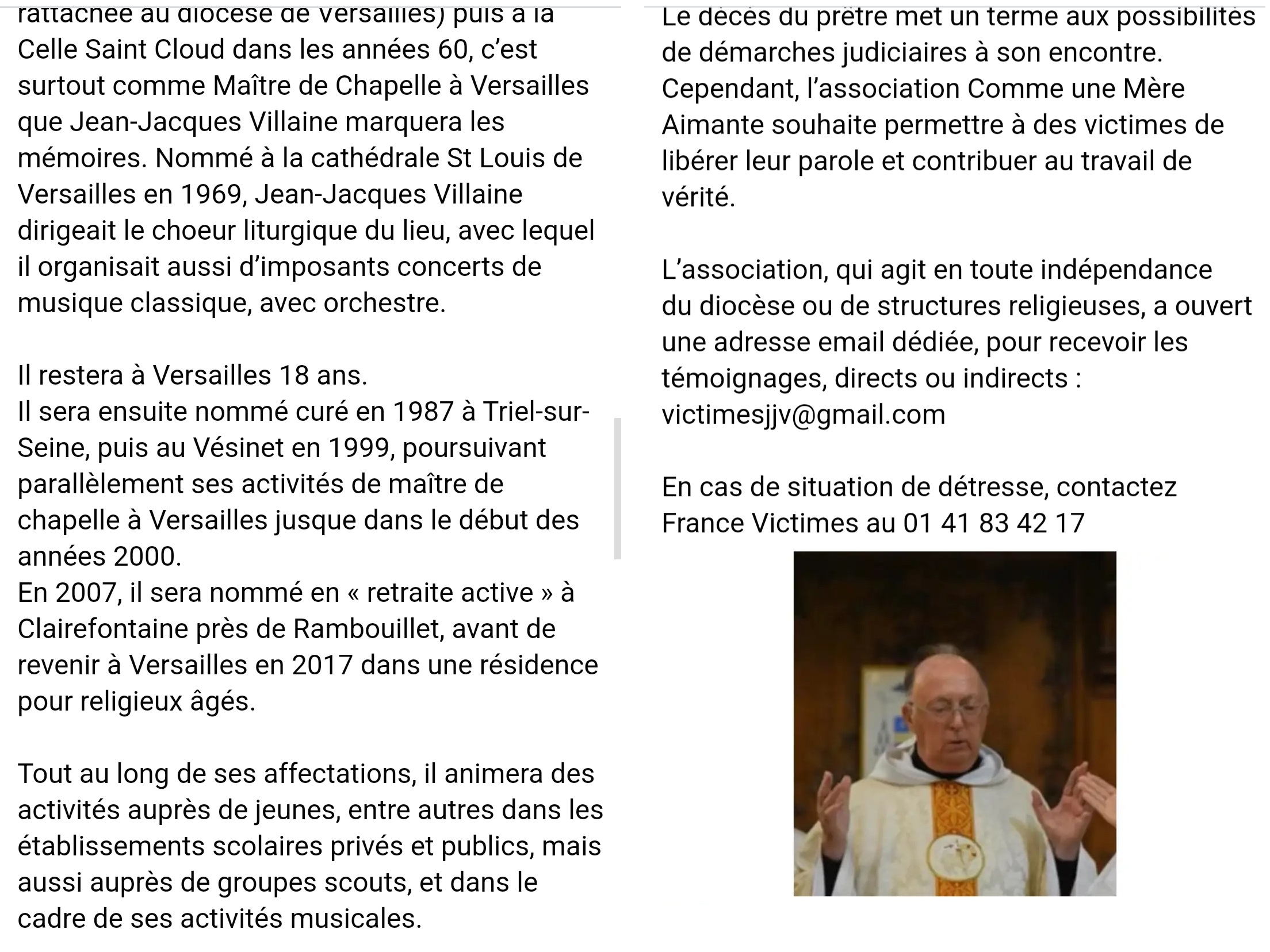 L’association Comme une mère aimante a publié un appel à témoins au sujet du père Jean-Jacques Villaine, sur sa page Facebook – le prêtre, reconnu à l’origine d’abus sexuels, est décédé, mais le diocèse de Versailles n’a jamais fait d’appels à témoins, alors que la possibilité d’autres victimes est réelle.