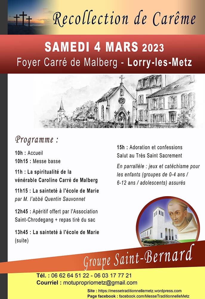 Accueil » Nos archives » Agenda: Récollection de Carême à Metz le samedi 4 mars Summorum Pontificum Agenda: Récollection de Carême à Metz le samedi 4 mars Un lecteur nous indique qu’une récollection de Carême sera prêchée ce samedi 4 mars pour les fidèles de Metz et alentours : La messe traditionnelle est célébrée tous les dimanches et fêtes à l’église Saint-Bernard des Plantières de Metz à 10h00. Messe traditionnelle à Metz Article précédentNominations dans le diocèse de Saint-Claude Article suivantUne dévotion picarde : le bienheureux Nicolas Barré à Amiens 2 mars 2023
