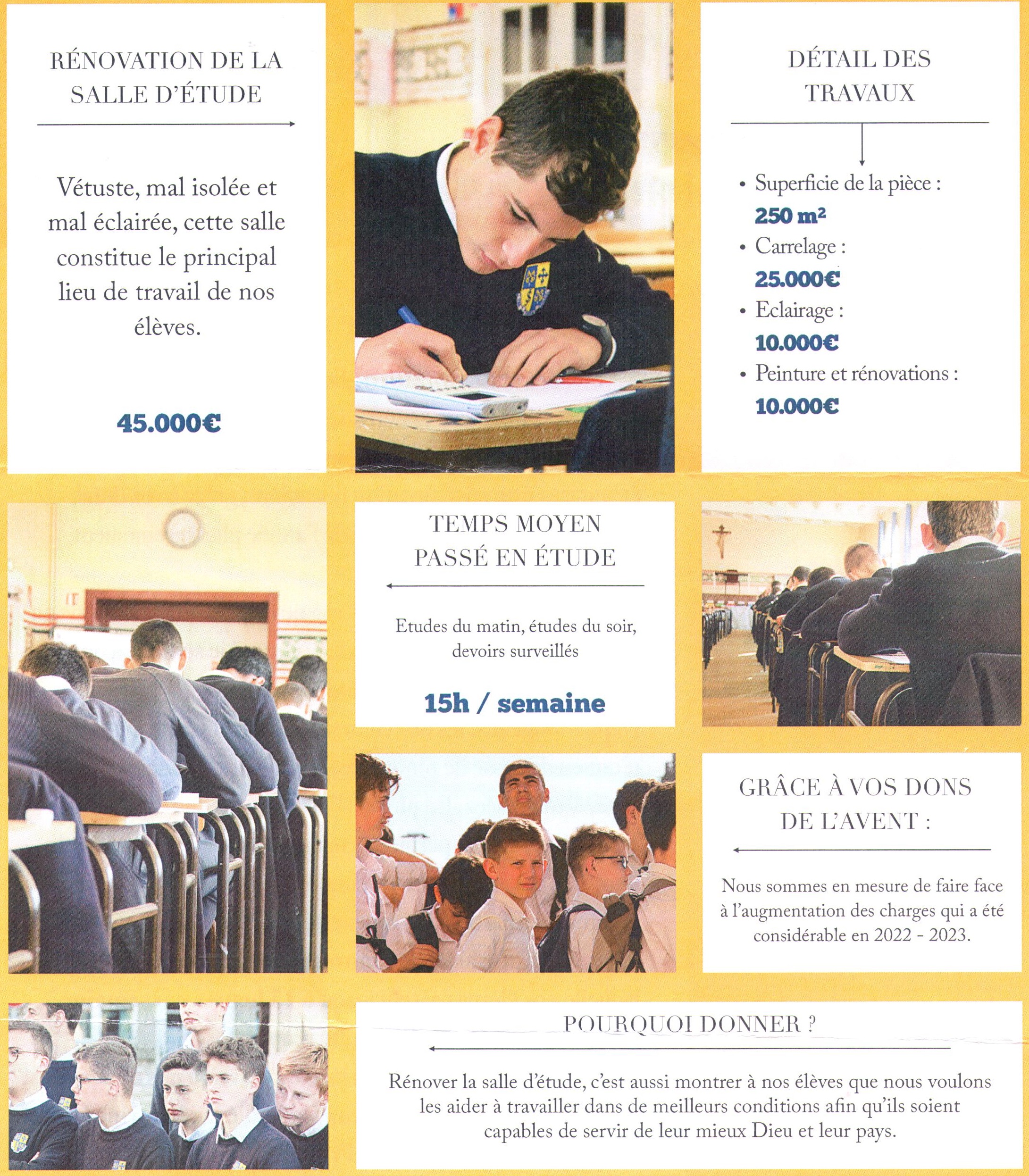 Chers amis, je vous en prie de nous aider à réaliser ce chantier, dont le montant s’élève à 45 000€, et qui me semble si important pour notre école. Je vous remercie d’avance pour votre générosité et votre soutien.