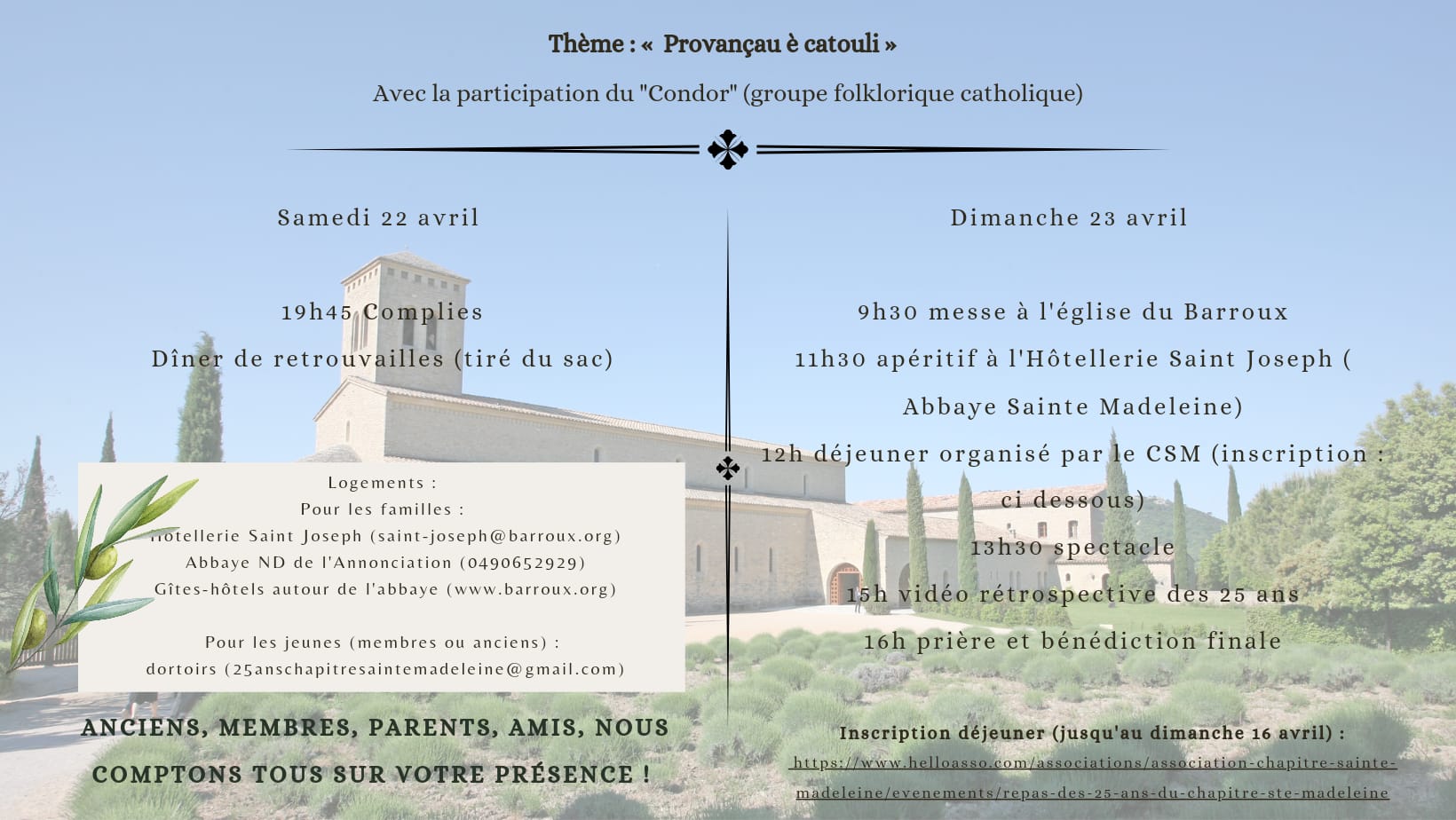 Le Chapitre Sainte Madeleine , groupe de jeunes rattachés à l’Abbaye Sainte Madeleine du Barroux, fête ses 25 ans les 22 et 23 avril à l’Abbaye :