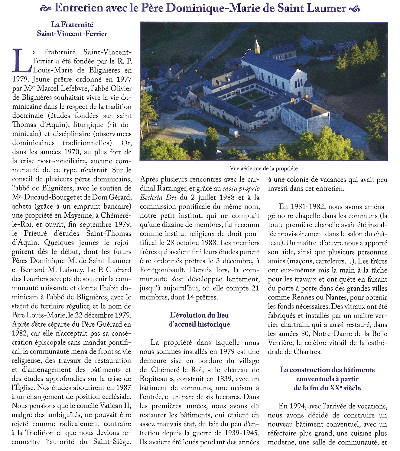 On lira également le long échange entre Anne-Marie Epitalon et le RP Dominique-Marie de Saint-Laumer, FSVF, qui évoque les nombreux travaux du Couvent Saint-Thomas d’Aquin de Chémeré-le-Roi ces dernières années (Fraternité Saint-Vincent Ferrier). On y lira également ce qui concerne les travaux en cours, ceux du Maître-Autel de l’église Conventuelle (Soutenir ici) (Extrait de l’article ci-dessous).