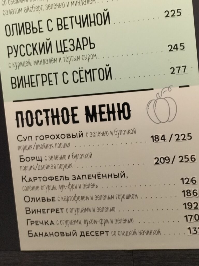 Des chaînes de restauration rapide russes s’adaptent aux prescriptions assez strictes – ainsi la chaîne de restauration russe Teremok propose en ce moment un menu de Carême, avec bortsch, kacha au sarrasin, pommes de terres frites et bananes au dessert.