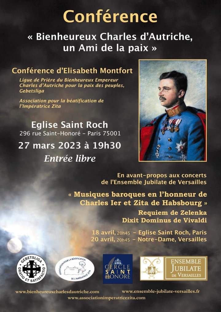 Un lecteur nous invite à diffuser cette annonce pour la conférence d’Elisabeth Montfort, de l’association pour la béatification de l’Impératrice Zita d’Autriche, ce lundi 27 mars à 19h30 à l’église Saint-Roch (Paris 1er).